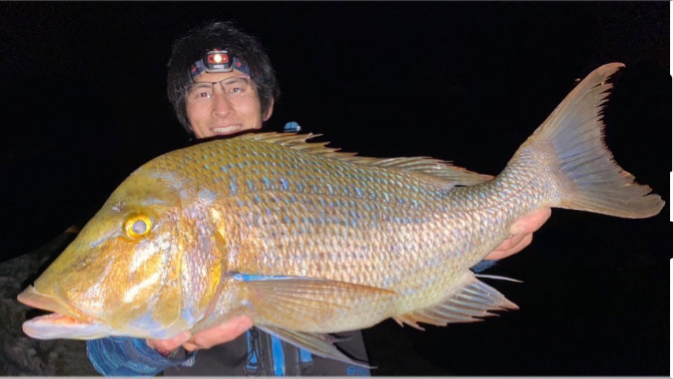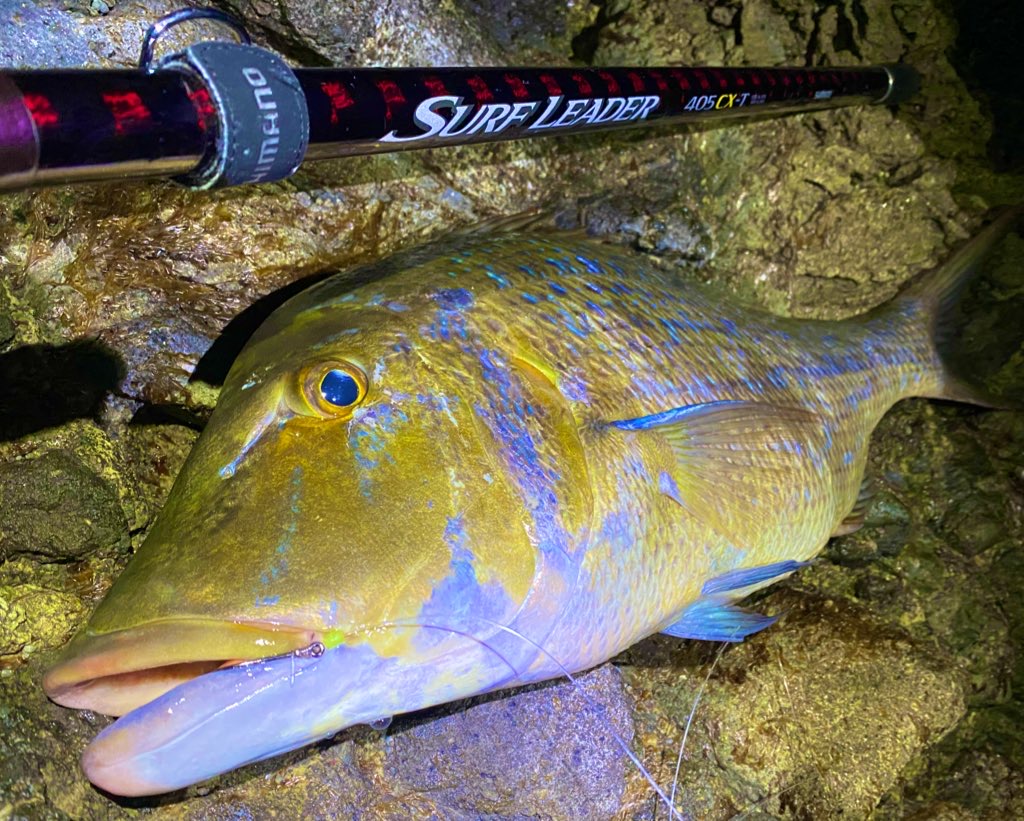 この隙に下段に降りるか悩んだが、手前の根を交わすため高い位置に居座りドラグフリーで待機。少しずつラインが出始めたので竿を煽る。すると魚信が復活。一気に下段へ降りて距離を詰めるが、ここでまた根に張り付かれた。ドラグフリーで暫く待っていると、魚が根から出る感触が伝わってきたのでいっきに竿を立て引き剥がした。魚は右側の根際を滑走する様に向かってくる。行けるところまで斜面を上り左に竿を寝かせ強引に寄せるとハマフエフキが浮上。同行者の差し出す玉網に納め釣り上げた。