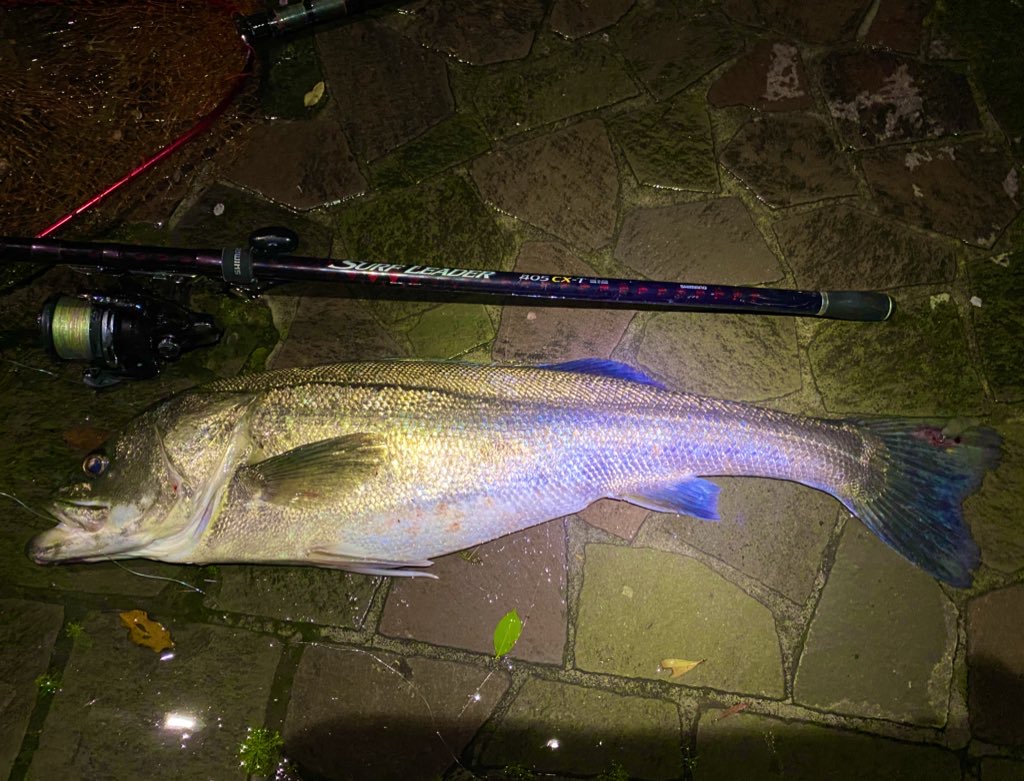 突如現れた驚愕のランカーサイズシーバスに唖然。平日にこんな大物が釣れても即リリースすることしかできない。長さだけ測ると96cmあった。弱らぬうちに納得いく写真も撮れないままリリースした。