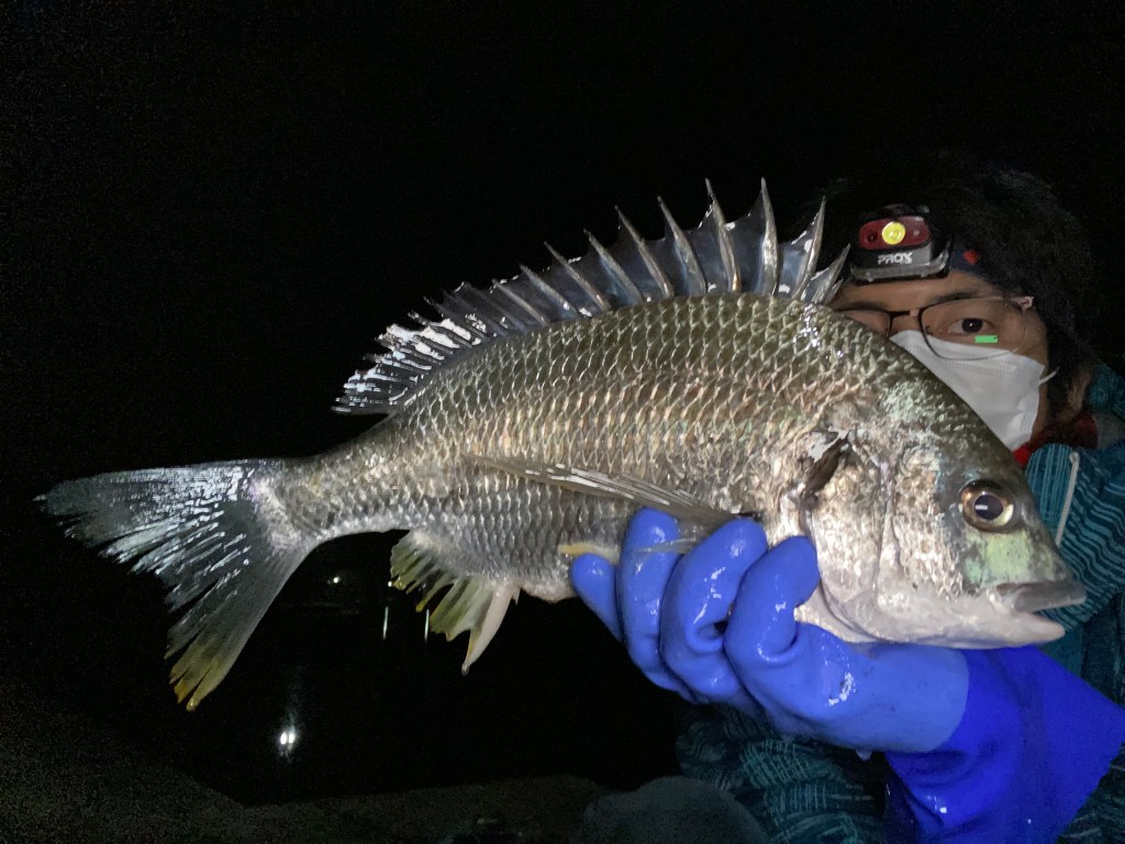 干潮から上潮に差し掛かったタイミングだが、未だ川の水流が強い。流心を責めるとフグの餌食になるので、手前の流れの悪い淵と水流の間に仕掛けを落とす。もう一本の竿もその少し先の常夜灯と常夜灯の中間に投げ込んだ。すると1分程度で先に投げた竿のドラグが軽く鳴る。竿先がカクカクと揺れるのを確認して合わせると魚信が手に伝わる。釣り上げたのは40cm程のキビレ。本命ゲットである。