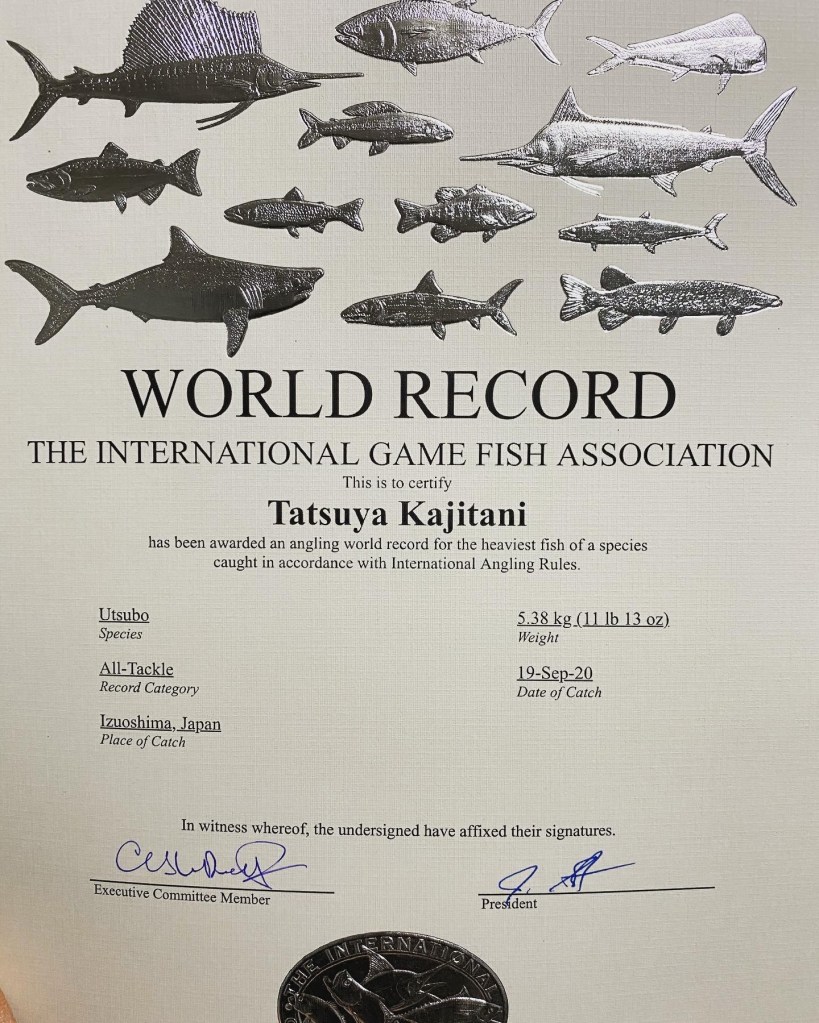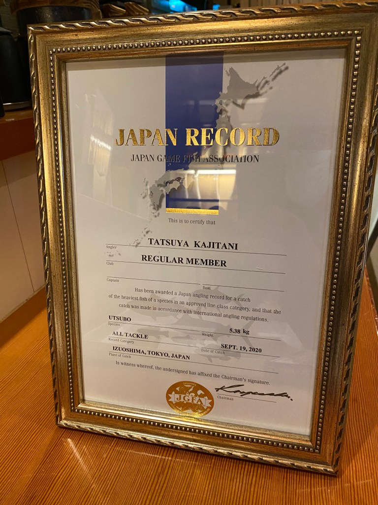 なんと5.385kg。JGFAおよびIGFAの記録を更新した。早速エントリーシートを作成してJGFAへ送った。1ヶ月後に日本記録に認定。そして半年が経過した4月中頃、世界記録の認定証が届き正式なIGFA世界記録となった。
