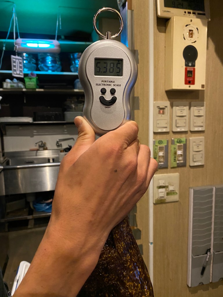 静岡に帰還し、真っ先に向かったのは三島のウツボ屋さん。そしてウツボ世界記録保持者の西野勇馬君にも連絡を入れた。すると長さは私の釣ったウツボの方が長いという。西野君の記録は5.05kg。そして運命の計測。