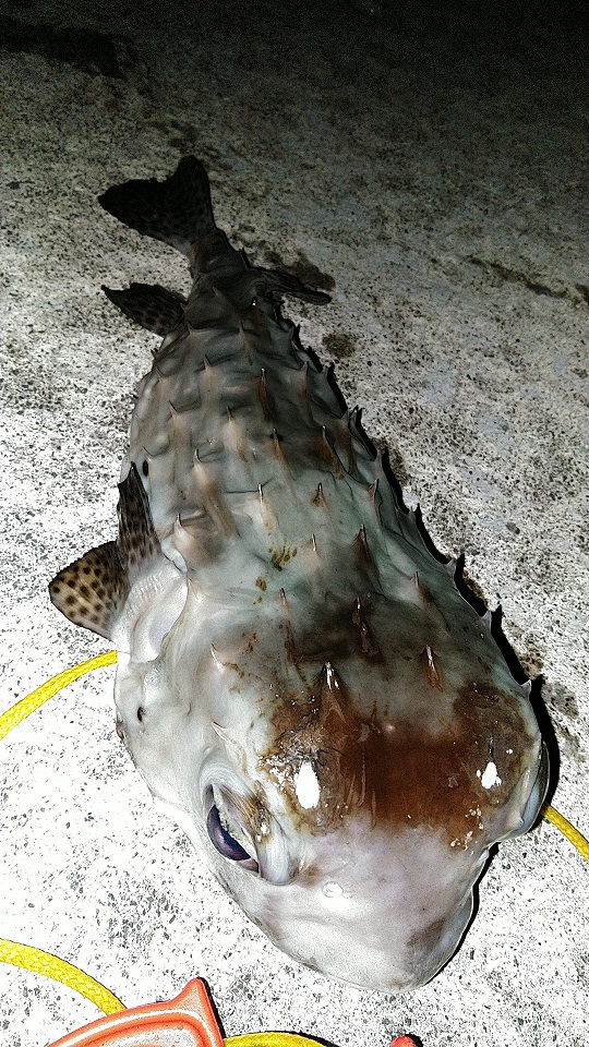 次に軽いドラグ逆回転してくれたのは、島名物のイシガキフグ。