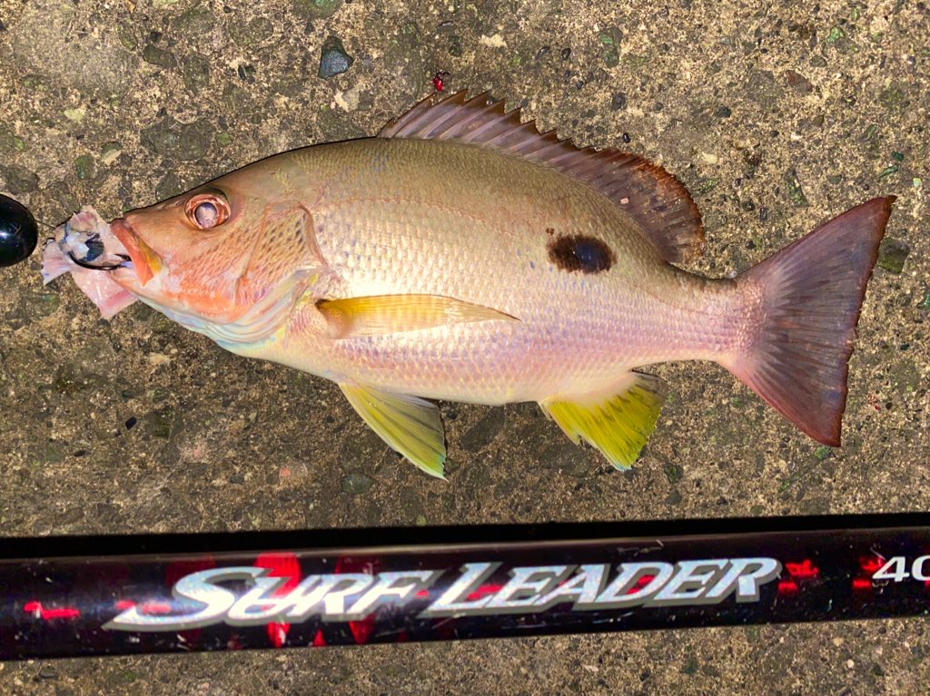 そこで夜中の間、場所を転々としながら潮の澄んだワンドを探し回っては竿を出した。最初に竿を出した場所はワンド内に張り出した短い小堤防。サバの切り身を投げて様子を見ることに。しばらくするとドラグフリーにしているにも関わらず竿尻が浮き上がる程の素早いドラグ逆転。しかし竿を掴んだ頃には逃げられていた。その後も30分程して同じアタリが出たが針にかからず。悔しいのでドラグをロックして竿を掴んだまま待機。すぐさま同じアタリが出た。これを糸を出さないようにしたことで向こう合せでヒットさせることができた。アタリの鋭さの割に小さそうな軽さ。上がってきたのはクロホシフエダイだった。