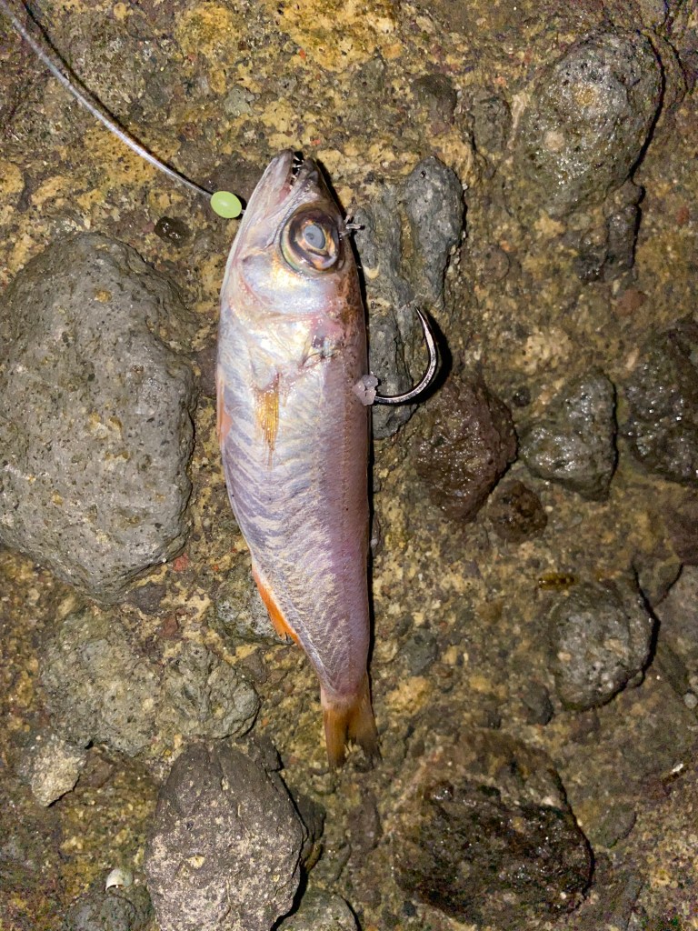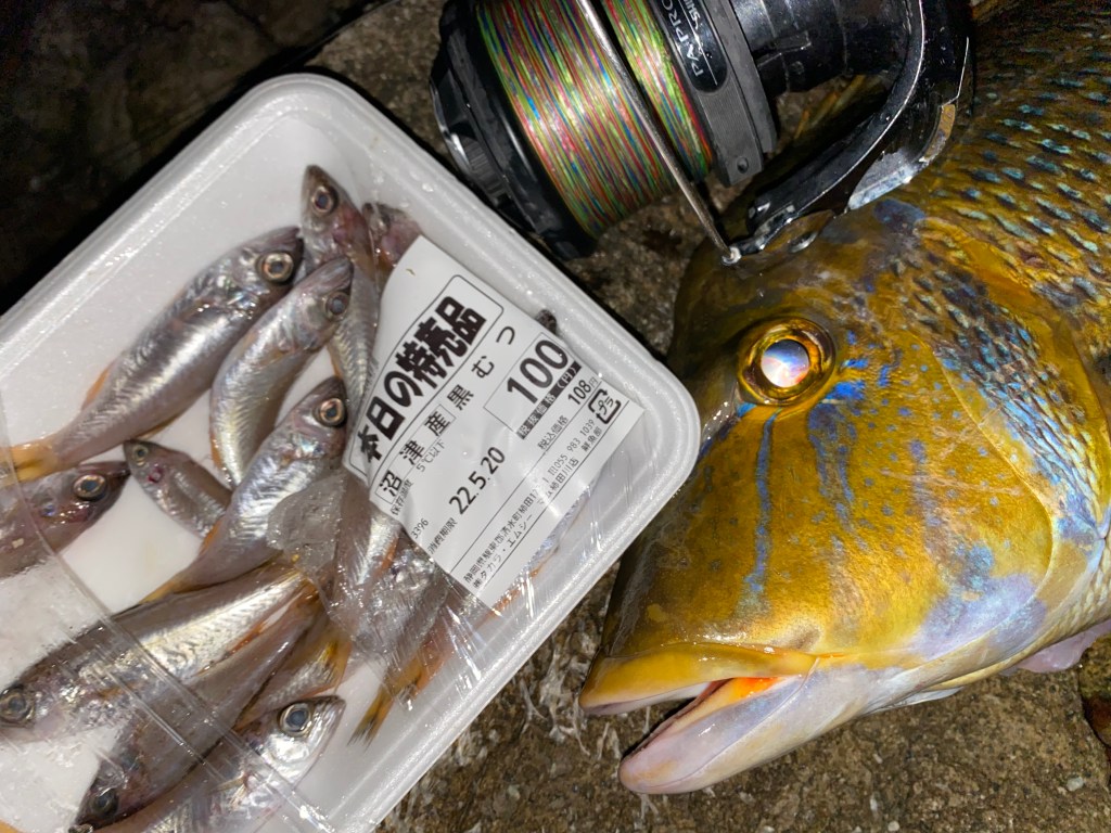 今回も前回釣れた潮周りと同じタイミングで0時過ぎに干潮。21時頃に入釣し下潮を狙う。時折ウツボに餌を取られ、仕掛けがグシャグシャにされる。それでも竿を出していると23時前には餌取りの反応が無くなったので、餌を新鮮なものに替えた。この日の餌はスーパーで購入した1パック100円の子ムツ。頭が硬く遠投しても外れにくい、私お気に入りの餌である。23時を過ぎた頃、鋭くドラグが鳴った。一度止まった後にもう一度走り始めたところで合わせるの乗った。あまり大きくなさそうなので一定の速度でクレーン巻き。上がってきたのは60cmのハマフエフキだった。