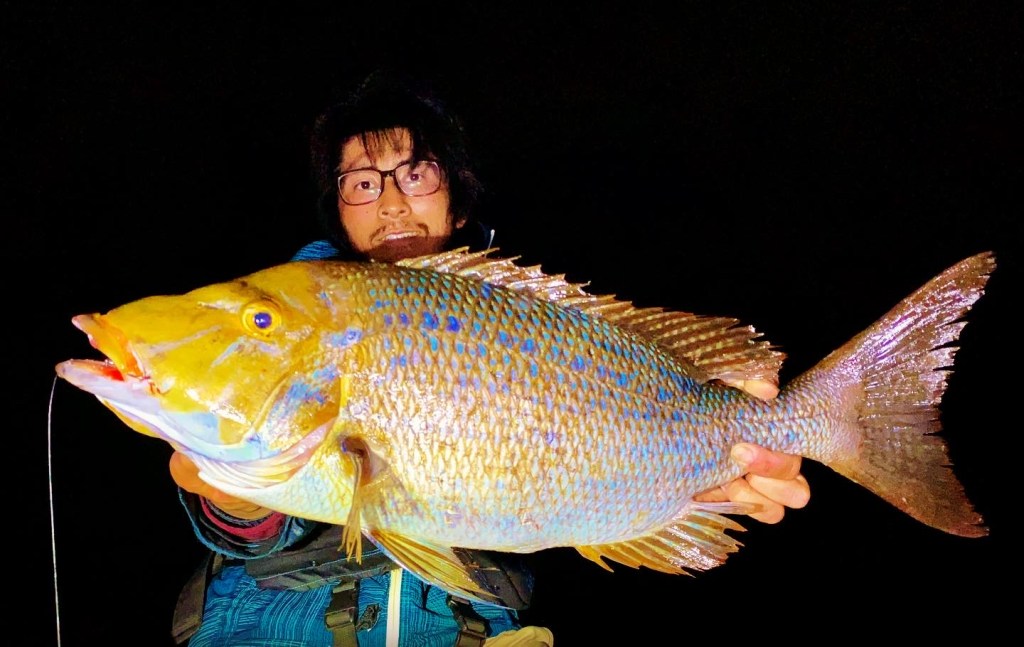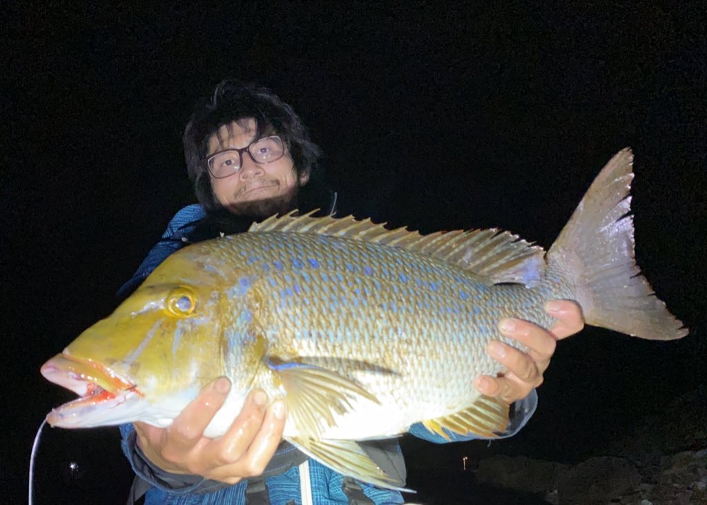 この日の活性は予想以上だった。まず1投目にマイワシ1匹を餌にした竿のドラグが走る。しかし約半年ぶりのハマフエフキのアタリにテンパり、合わせのタイミングを見誤りすっぽ抜けてしまった。悔しいが、またすぐ来るはずだと今度は竿2本にイカの切り身と鯖の切り身を付けて投げ込む。10分程して、イカの切り身を付け、根が点在する砂地へ遠投した竿のドラグが勢いよく鳴り響いた。今度は竿を手に取り、魚が走っているタイミングで合わせを入れる。しかし根にラインが擦れている感触。魚はフッキングしているようで、ラインを緩めるとすかさず走る。しかし根擦れでラインが巻かない。30秒ほどで魚信は消えて根掛かりに変わってしまった。仕掛けは回収出来たが、リーダーがザラザラとしていた。その仕掛けを組み直している最中にもう一本鯖の切り身を付けた竿が一発ギィィとドラグが鳴ったがすぐに魚信が消えた。回収すると鯖の切り身は皮だけになっていた。餌をイカの切り身に変え、根ズレが気になり砂地が広がる遠投ポイントへキャスト。フエフキは根側のポイントでアタリが出やすいが、これだけアタリが多ければ砂地でもアタリが出るだろうと判断。ヒット後に砂地で走らせ、魚をバテさせればキャッチ率は上がる。時刻は22時半。潮位がかなり下がってきた。潮止まりになるまでにもう一発来るかな。それを逃したら終わりだな。ブツブツと独り言をつぶやいていると、泣きの弩アタリが炸裂。甲高いドラグ音の後、一旦停止、そして再加速。フエフキ独特の走り方だ。ドラグをクイックで締め合わせを入れるとしっかりフッキングした感触。すぐさまドラグをフリーにし、ハンドスプールでどんどん沖へ走らせる。走りのスピード感が毎度ヒヤヒヤする。動きが止まったところで一気にリールを巻き主導権を握る。魚がバテるとさっきの走りが嘘のように大人しくなる。そしてラスト、手前20m程に広がる根をかわしていく。ここに差し掛かると魚が最後の抵抗を見せるので少しドラグを緩め準備。根側の抵抗の後、良型のフエフキが浮上。スケールを当てると70cmだった。