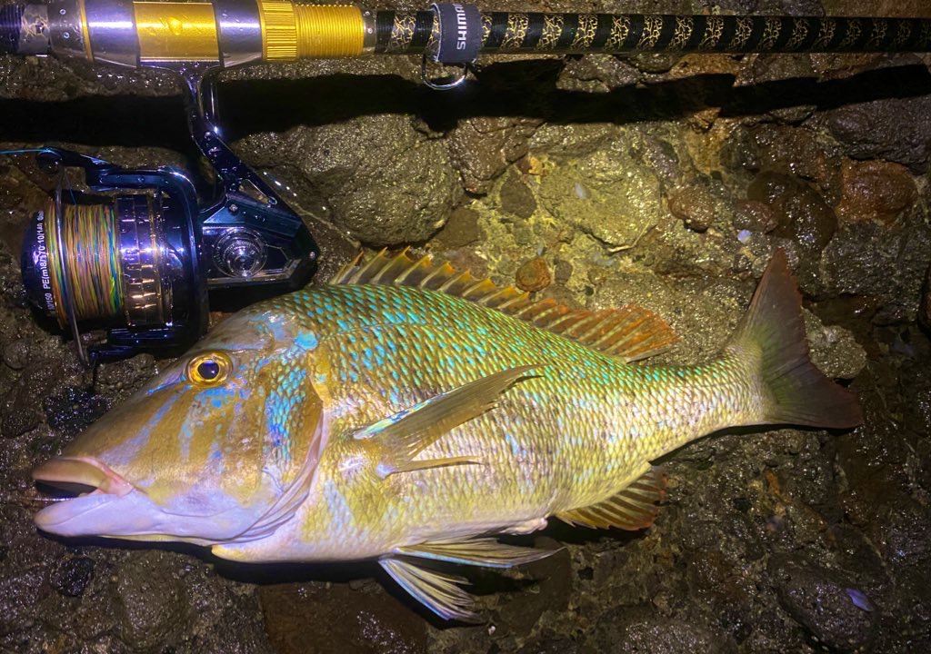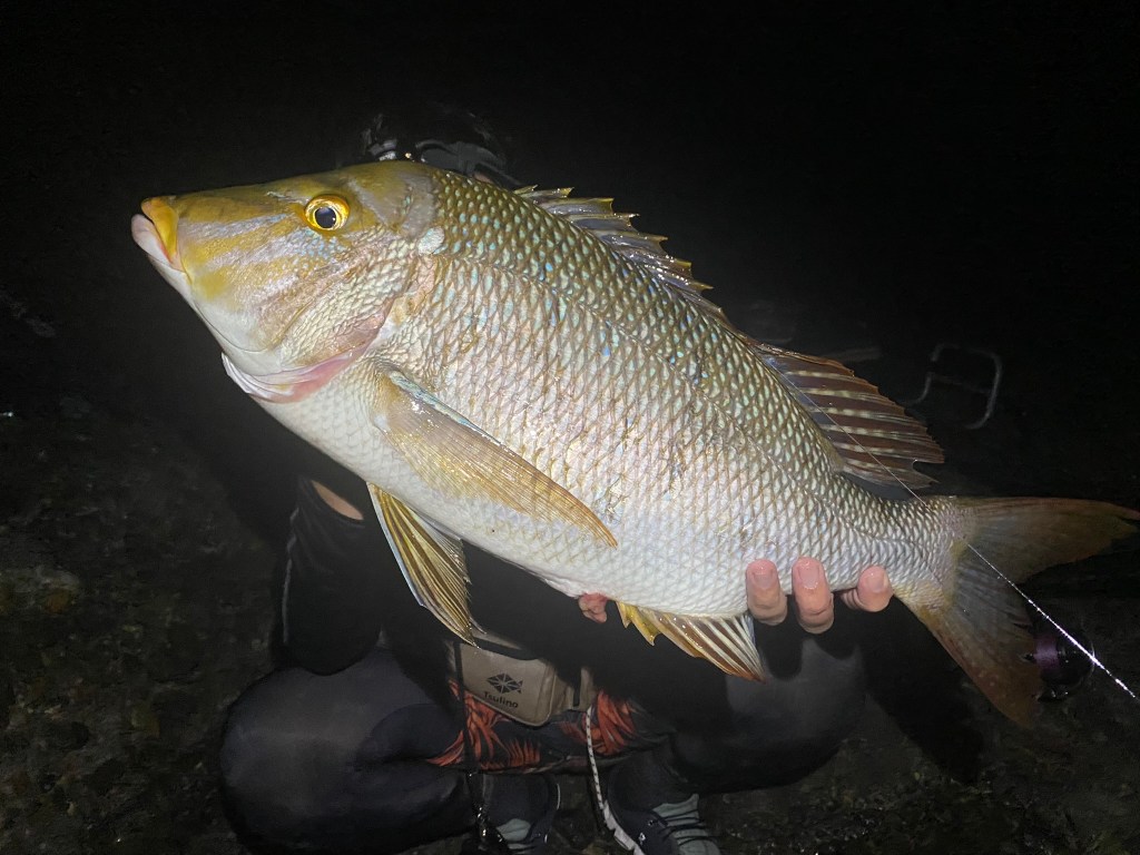 この日以降は1度だけ、8月21日に単独で深夜から入釣。夜中の2時半頃に60cm級のハマフエフキを1尾釣り上げた。潮の濁りと、産卵期を迎えた状況であまり狙いに適さないと考えていた中での釣果で、ポテンシャルの高さを伺わせた。