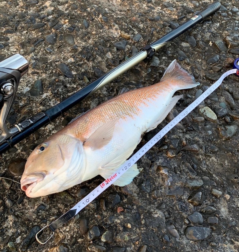 セイゴと遊んでいるうちに夜は明けてしまっていたが、断続的にアタリはあり合わせても乗らない時間が続いていた。半分諦めながらも粘っていると、鈴にハッキリとしたアタリと引き出されるドラグ!十分食い込ませてから乗せるが、遠投のためか引きは強くはない。小型のアカエイかな?と疑いながら寄せてくると、時折ゴクゴクと頭を振るような引き。これは何かと足元まで寄せてくると鋭い突っ込み、ギラリと光る魚影が見えると、マダイだ!とギャラリーから声がかけられる。いや、でもちょっと違う、これはアマダイだ!と訂正が入る。まさかの初魚種に緊張しながらも取り込みに成功したのは、驚きのシロアマダイ48㎝であった。