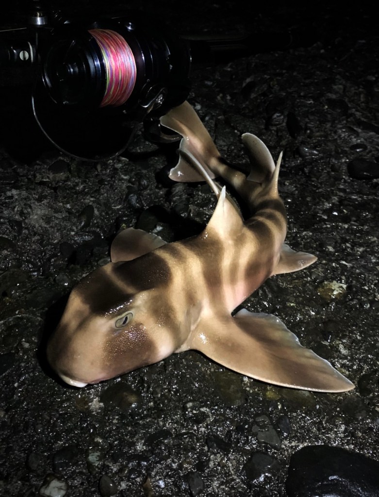 下げ潮が進み、干潮の前後にはネコザメらしきアタリは遠のき、沈黙の時間となってしまった。「まさか、これで終わり?」と深夜の海を見つめていると再び竿先を揺らす大きなアタリ。静寂を破るドラグ音でラインが一気に引き出されていく。大アワせで乗せた後やり取りの末、おなじみのドチザメの130㎝クラスをキャッチした。