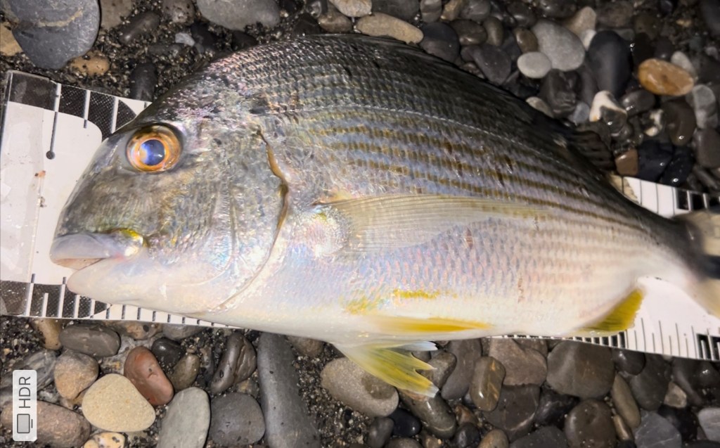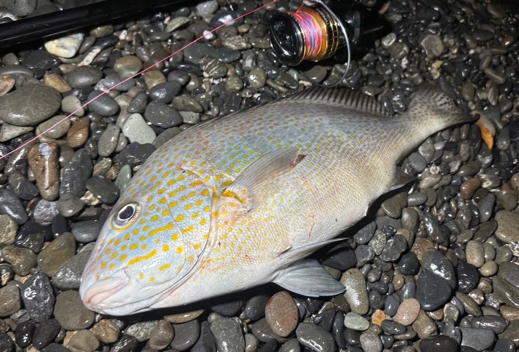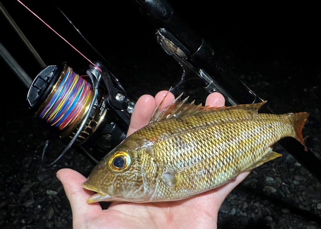 午前2時過ぎ、数回竿先が絞りこまれ、ゆっくりスプールが逆回転した。慌てて竿を取り、重量感のあるやり取りを開始するがすぐに動かなくなってしまう。まるで底に張り付いたような感触に、「エ」「イ」の二文字が頭をよぎる。1分ほど糸を緩め放置した後、竿をあおると魚が動き出したので、ゆっくりとリーリングする。波打ち際に近づいてきて、ようやくグングンと頭を振る感覚があり胸をなでおろす。一気に引きずり上げた魚を確認すると、なんと41㎝のコロダイであった。