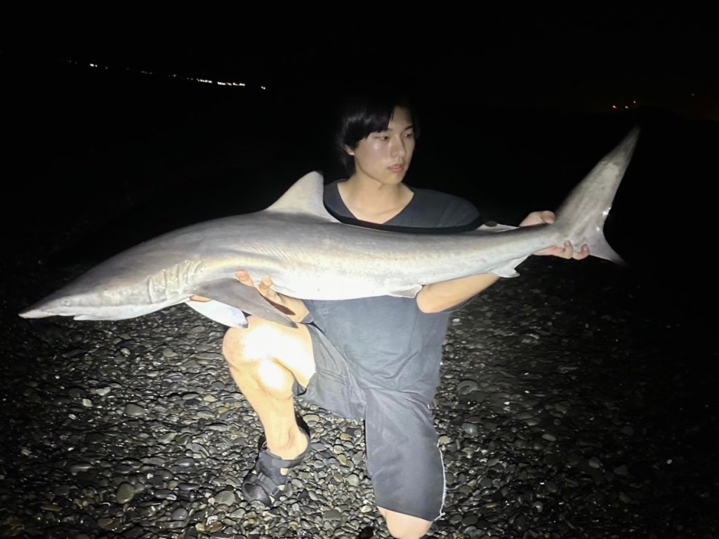 これが当たったのか、満潮一杯から下げ始めの0時30分ごろ、ガッっと竿が倒れ、海に向かって引きずられる!慌てて駆け寄った息子が竿を取りファイトを開始、魚は横走りをして止めることができない!しかし真夜中のサーフは無人、魚を自由に追いかけることができた。強い引きに耐えること数回、荒い波間の中に現れたのは茶色の大型魚体。背ビレをつかんで波打ち際まで引きずり上げたのは、130㎝のメジロザメ属のサメであった。その場での同定は困難であったが、ドタブカかカマストガリザメと考えている。