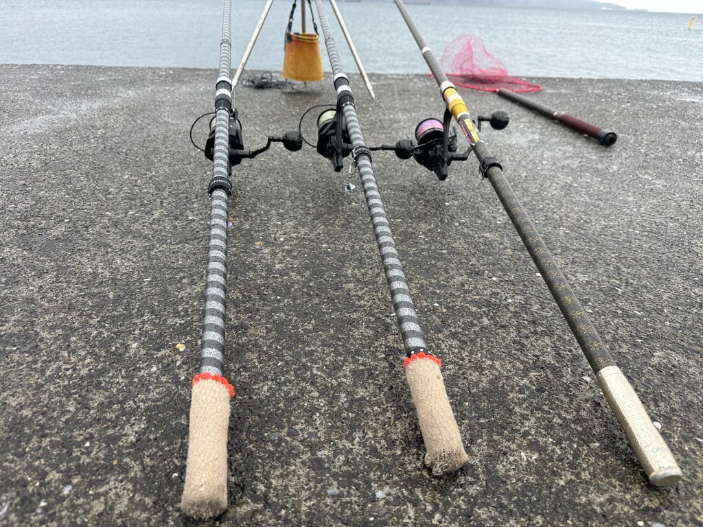 時刻は15時過ぎ。ゲストハウスに夜までに向かうことを考えるとそろそろ釣り上げたいと思っていた頃、背後からの追い風が吹き始め、PE1.5号のフルキャストをうまく風に乗せることができ、アオイソメの房がけを120m以上沖へキャストすることに成功。ドラグフリーにセットし、周辺を散策しているとドラグ音が聞こえてきた。駆け足で戻ると120mキャストの竿のラインが弛んでいた。居食いしていることを祈り、ラインを更に送って20秒ほど待機。魚の気配がないので糸ふけをとり意を決して合わせを入れるとグンっと重さが伝わる。間違いなく何かが掛かっている。堤防基礎の捨て石に魚を取られないように竿を立て、ラインの細さにも気を配りながら早めに巻き取る。やがて浮上してきた赤い魚は、間違いなくシロアマダイで興奮し手が震える。記念に浮上シーンだけスマホで撮影した。