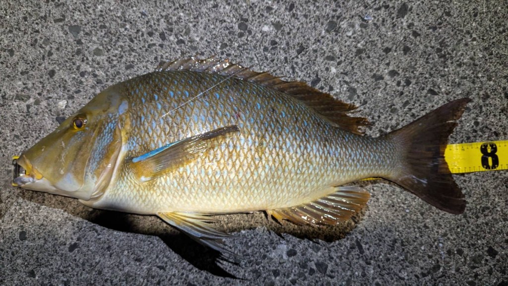 9月15日月曜日(祝)当日はかなり気温が高く風もほとんど吹いていない状況で潮回りは15日が小潮、満潮が21時20分、16日は長潮に変わり干潮が6時54分でした。渡提した15時半から釣り揚がりの翌朝5時まで、堤防の付け根から先端に向かってダラダラと潮が流れていて潮色も良く雰囲気もかなりあり暗くなる前から竿を3脚2台に2本づつ、計4本セットした。釣座は身体が既に疲労困憊だったので移動を少なくしたくて船着き場から30㍍位離れた堤防の付け根付近の内海側にする事にした。釣りを始めてから暗くなるまではエサ取りが活発でどのエサを付けてもすぐに無くなってしまう状況だったが、日が落ちて暗くなるとエサ取りの反応も随分とマシになってきた。そんな中で釣れてくるのはウツボ、黒アナゴ、イトフエフキだった。今回構えた釣座は尊之島の周辺の為、水深は他のポイントと違い浅い所では6㍍程しかなさそうだったのでいつもよりも極力、海面に光を当てないように注意をしてその時に備えた。満潮が21時20分でその1時間半前からがチャンスタイムだと考え、頻繁に仕掛けを打ち返していると10分程放置していた1番左の竿に20㌢程のカサゴが釣れた。この竿は正面に白いブイが浮いていたので斜め左方向50〜60㍍に投げていた竿。エサはサバの切身。今までと違う魚が釣れた、海に変化があった。やはりこれからがチャンスタイムかも知れない。仕掛けを確認するとハリから10㌢位の所が傷ついていたので新しいハリスに交換する。そして再びサバの切身を付けて同様に斜め左方向へ投げ込む。ついでに他の竿も左から順にエサを付け替えて投げ直す。チャンスタイムの待っている時間は殺気が伝わらない様になるべく竿を見ない様に道具を整理したりしてやり過ごす。しかしやはり気になってしまってカサゴの釣れた1番左の竿を見ると、目の前で竿先のライトがググググ〜ッとお辞儀をして竿尻が浮く光景が目に飛び込んできた。そのまま引っ張られて尻手ロープが張りロープに付けておいた鈴が鳴った!この瞬間が堪らない。急いで駆け寄り、シーソーになっているリールシートを左手で握り、右手でロープを外す(私はリールは右巻きです)。キツめに締めてあるドラグはジリジリと音を立ててまだまだ走られている。大きくアワセをいれると物凄い重さが手元に伝わり竿がひん曲がった。この時、「あ、この竿、1番柔らかい竿だ…大丈夫かな…。」と考えるがもうどうにもならないのでリールを4、5回巻いたあと再び追いアワセを入れる。魚は全然怯まずに左沖へ走っている様だ。これなら正面のブイの事は心配しなくても良さそうだと思いひたすらゴリ巻きをする。こちらがゴリ巻きすると負けず嫌いなのか、お返しと言われているかの様に力強いパワーで突っ込み返される。仕掛けは新品に付け替えたばかりなので気にせず「頑張れ!竿、頑張れ!」と竿と自分にエールを送る。そして玉網が少し離れた所にあったので遠くで釣りをしている同行者を呼び寄せた。相手が突っ込まない時にひたすらゴリ巻きをして相手が暴れたらひたすら耐えてを4、5回繰り返していると同行者が到着したので玉網を持って待機してもらう。相手は近くに寄ってきていると思うが全然姿を現さず、2人で海面を照らしていると白い魚体が海底から徐々に浮上してきた。「タマンだ!デ、デカくないですか!?」と同行者。「デッカ!何だコレ!?」と私。完全に浮き上がり最後の抵抗をする魚を何とか玉網の中に収め、2人で大喜び。玉網を堤防にズリ上げる同行者。物凄く重そうだ。玉網越しにドスンと横たわるタマン。急いでメジャーを手に取り「これは80いったでしょ!!」なんて興奮しながらメジャーの上に横にする。口閉じ、尾開き、78㌢…。まじかよ、これでも80に届かないのか…。尾ビレの先から80の目盛りまでの2㌢の間隔が凄く長く感じた。